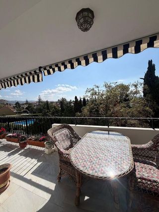 Esta magnífica vivienda combina una ubicación inmejorable con amplios espacios interiores y una encantadora terraza cubierta ideal para disfrutar del clima de la Costa del Sol durante todo el año. Situada en una de las zonas más demandadas de Nueva Andalucía, se encuentra a tan solo 8 minutos andando de Puerto Banús, con parada de taxis en la puerta, el Casino a escasos metros y dos supermercados a distancia peatonal, además de una excelente oferta de bares, restaurantes y servicios en Centro Plaza. Zona de gran demanda de alquileres en corta temporada a lo largo de todo el año tanto por veraneantes como golfistas el resto del año. Con tres habitaciones está distribuida en una sola planta esta propiedad cuenta con 140 m² interiores y una impresionante terraza de 38 m² con orientación Sur con vistas abiertas a los jardines de la comunidad y la piscina y otra terraza con acceso solo desde la habitación principal. La disposición escalonada del edificio asegura gran luminosidad a todas las viviendas del complejo aun estando en planta baja. Amplio salón-comedor con acceso directo a la terraza mediante un amplio ventanal incrementando la sensación de amplitud de la vivienda en su conjunto. La cocina incluye zona de desayuno y un gran lavadero. La vivienda dispone de tres dormitorios espaciosos, todos ellos con excelentes calidades y armarios empotrados. El dormitorio principal destaca por su amplitud y su vestidor, además de contar con un elegante baño en suite con ducha. Los otros dos dormitorios uno en suite y el otra con baño fuera que actúa como baño de invitados. Todos los baño modernos y perfectamente equipados, lo que convierte esta propiedad en una opción ideal tanto para familias como para quienes reciben invitados con frecuencia. El conjunto residencial ofrece un ambiente tranquilo y seguro, rodeado de extensas zonas verdes donde disfrutar de la calma y el aire libre. La urbanización cuenta con piscina comunitaria y jardines perfectamente cuidados, ideales para
