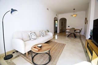Impecable apartamento completamente reformado con calidades de alta gama y con impresionantes vistas al mar. Esta excepcional propiedad ha sido renovada por completo, incluyendo nuevas ventanas, suelos, puertas, armarios empotrados, cocina, baños, aire acondicionado, persianas eléctricas, cortinas de cristal en la terraza principal y en el patio trasero... ¡todo es completamente nuevo! Se vende además totalmente amueblada, con la mayoría de los muebles a estrenar, por lo que solo necesitarás tu maleta para empezar a disfrutarla. Ubicado en una planta baja elevada y en esquina, el apartamento ofrece acceso fácil y sin escalones directamente desde la zona de aparcamiento comunitario. La cocina americana de estilo abierto está completamente equipada con electrodomésticos BOSCH y se integra en un luminoso y espacioso salón. Las amplias cortinas de cristal de la terraza principal permiten la entrada de abundante luz natural y enmarcan unas preciosas vistas al mar, complementadas por ventanales laterales adicionales. El dormitorio principal es muy amplio y cuenta con un moderno baño en suite, además de acceso directo a la terraza principal, donde podrás disfrutar de hermosos amaneceres. Los otros dos dormitorios también son espaciosos y cuentan con armarios nuevos, compartiendo un baño con ducha completamente renovado. El segundo dormitorio dispone, además, de acceso a un patio trasero privado con espacio de almacenamiento extra, cerrado con cortinas de cristal. Gracias a su cómoda distribución y a sus mejoras de alta calidad, esta propiedad es ideal tanto como vivienda familiar para todo el año como para disfrutar de inolvidables vacaciones en la Costa del Sol. El complejo es cerrado, con varias zonas de aparcamiento exclusivas para residentes y dos piscinas. Se encuentra en la parte alta de Calahonda, a poca distancia a pie de varios restaurantes y de una parada de autobús con conexión a Fuengirola. La playa y todos los servicios están a tan solo 7-8 minutos en coc