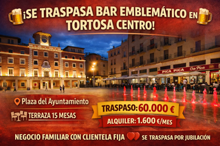 SE TRASPASA BAR CON TERRAZA EN PLENO CENTRO DE TORTOSA Se traspasa bar de tapas y cafetería con 25 años de actividad, ubicado en la Plaza del Ayuntamiento de Tortosa, una de las zonas más transitadas y turísticas de la ciudad. Características: Superficie: 70 m2 Terraza para mínimo 15 mesas de 4 personas Local en perfecto estado Listo para entrar a trabajar Licencia en vigor Mobiliario y maquinaria incluidos Condiciones: Traspaso: 60.000 € Alquiler: 1.600 €/mes Negocio con clientela fija, ambiente familiar y excelente reputación. Se traspasa por jubilación. Ideal para quien busca un negocio consolidado y rentable desde el primer dia.