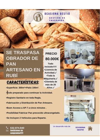 Se traspasa obrador en Rubi por jubilación. Funcionando hace 24 años, licencia para la fabricación y distribución de pan y bollería. Posibilidad fabricación y distribución de pan precocido ultra congelado. Nave de 300m² , totalmente equipada, 3 hornos, camara fermentación-congelacion para 6 carros, reposadora, formadora de barras, divisora, reposadora, cargador de barras, 10 carros para 18 latas, total 300 latas, se incluyen 2 furgonetas para reparto. Toso preparado para empezar a trabajar de inmediato. Licencia y permisos sanitarios en regla, no dude en contactar para solicitar mas información. REF: 20021138 TLF: 632874840