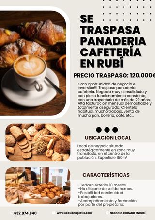 Se traspasa cafeteria, panadería y obrador en Rubi en pleno funcionamiento, clientes de mas de 10 años, facturación demostrable, motivo del traspaso por no poder atender, traspaso 109.000€, alquiler 800€/mes, plazo de contrato 10/15 años.