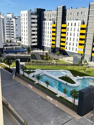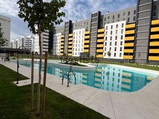 Vivienda a estrenar en la nueva zona de expansión de la ciudad. El lujo de poder estrenar una vivienda con unas excelentes calidades y acabados es posible Urbanización cerrada con gran piscina comunitaria, zona de juego para los mas pequeños, club social y pista de paddle. Muy cerca de la boca de metro y magnificas comunicaciones. La vivienda se encuentra en una primera planta y es completamente exterior y muy luminosa. Se distribuye en hall de entrada con gran armario empotrado, espaciosa cocina independiente complemente amueblada y equipada con todos los electrodomésticos, lavadero, gran salón independiente haciendo esquina y con acceso a una agradable terraza, tres dormitorios dobles todos con armarios empotrados y el principal con baño incluido con placa ducha. El segundo baño dispone de bañera. Esta climatizada central y dispone de aerotermia y suelos de tarima. En el precio se incluye una plaza de garaje y un trastero. Se busca un inquilino para larga estancia (duración mínima de un año ). se alquila sin amueblar. Disponibilidad inmediata.