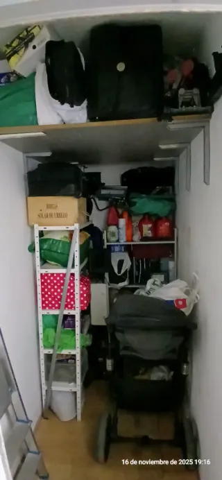 Trastero en venta en Las Fuentes. Son cinco metros cuadrados y tiene tres metros de altura donde se puede hacer un altillo. Se incluyen tres estanterías ancladas.
