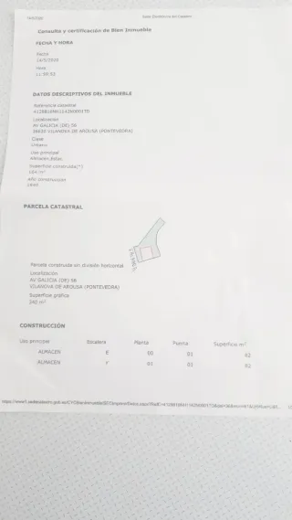 Vilanova de Arousa ( Calle Concepción Arenal ). Local comercial acondicionado de 229 m2, situado en bajo de un edificio de viviendas con acceso directo a pie de calle. Distribuido en dos niveles, una planta baja de 72 m2 y altillo de 150 m2. Zona de exposición en planta baja y altillo, varios despachos, dos almacenes y un aseo. Fachada: 8,9 m. Fondo: 8,15 m (pb) y 12,55 m (altillo). Altura libre: 4,1 m (pb) y 2,8 m (altillo). Referencia catastral: 4424216NH1142S0002UX Precio: 137.000€.