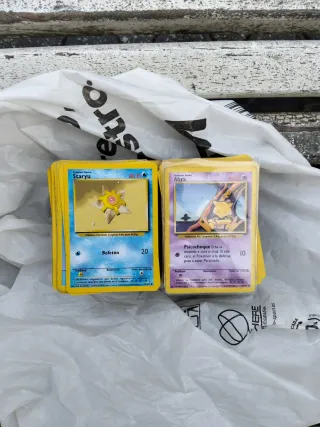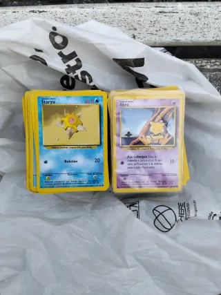 Lote de cartas Pokémon antiguas, incluyendo Staryu y Abra. - Carta Staryu con ataque Bofetón. - Carta Abra con ataque Psicochoque. - Ideal para coleccionistas.