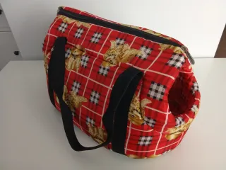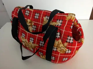 Transportín acolchado con un divertido estampado de cuadros escoceses y perritos. - Cierre de cremallera. - Asas de transporte resistentes. - Abertura lateral para la mascota.