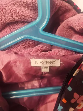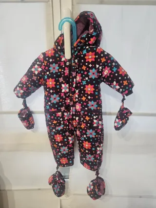 Mono de nieve para bebé con un divertido estampado de flores en varios colores sobre fondo oscuro. Incluye manoplas y patucos. - Talla 62 cm. - Cierre de cremallera. - Capucha forrada.
