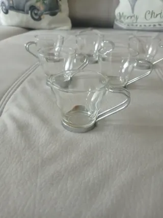 Conjunto de seis tazas de café de cristal con asas metálicas. - Diseño elegante y moderno. - Aptas para bebidas calientes y frías.