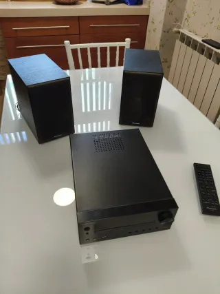 Sistema de sonido Pioneer en color negro. Incluye amplificador y dos altavoces. - Amplificador con reproductor. - Dos altavoces. - Mando a distancia.