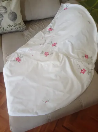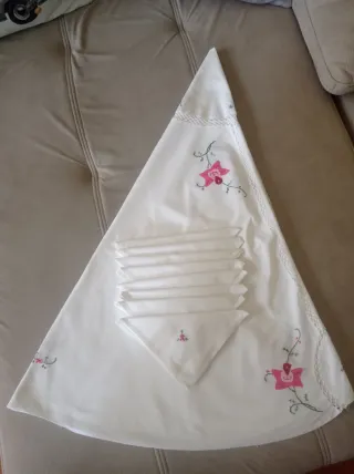 Elegante mantelería con un diseño de flores bordadas en tonos rosa y blanco. Ideal para dar un toque especial a tu mesa. - Diseño redondo - Bordados florales. - Incluye servilletas a juego(8 und) Hecha a mano. Ancho del mantel 1'58 cm.