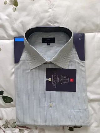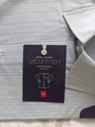 Camisa de vestir con un diseño de rayas finas. La etiqueta indica que es una mezcla de algodón y fácil planchado. - Diseño de rayas finas. - Mezcla de algodón. - Fácil planchado.