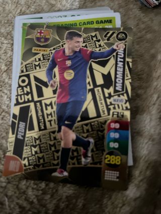 Tarjeta de colección de Pedri, edición Momentum de EA Sports. - Diseño con fondo dorado y negro. - Incluye escudo del FC Barcelona y logo de Panini. - Muestra estadísticas de juego.