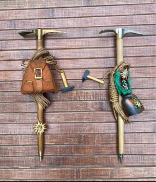 -Dos pequeños piolets de madera con detalles decorativos, perfectos para ambientación. - Uno con mochila, edelweis y cordaje. - Otro con bordado, cencerro y cordaje. -Medidas 20 x 7 cm. -Perfecto estado -Pequeña raqueta de nieve canadiense tradicional. -Procedencia reserva Le Huron, Quebec-Canada. -Fabricada en madera de fresno y tripa de reno, igual que sus hermanas mayores. -Medidas 35 x 13 cm. -Nueva.