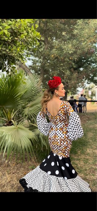Traje de flamenca de diseñador con un estampado único. Solo puesto una vez del año 2025 - Mangas abullonadas con lunares. - Falda con volantes y lunares. - Escote en V.