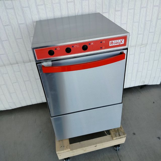 Lavavasos Industrial de 40×40 cm de la marca Romux. Acero inoxidable. Lavados de 120/180 segundos. 3 posibilidades: sin bombas, con 2 bombas (AB + DT) y 3 bombas (AB + DT + DS). Tiene 1 cesta de 40x40 cm. Altura útil: 29 cm. Potencia: 2730 w. Voltaje: 220 V
