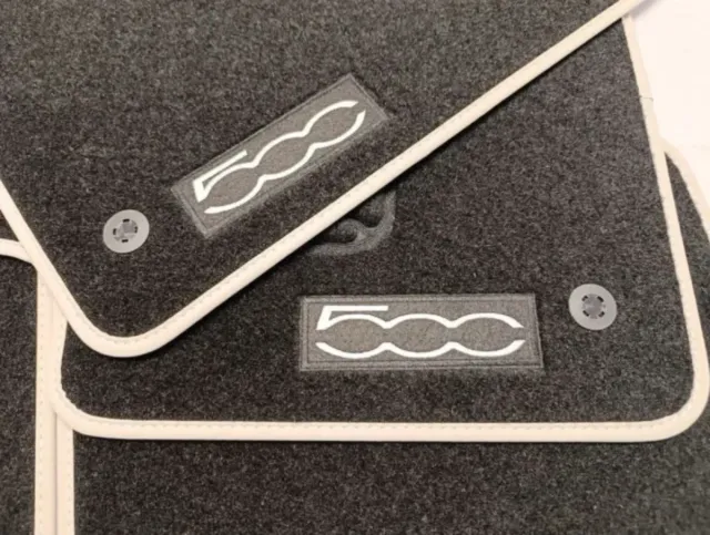Juego de 4 Alfombras en Moqueta delanteras y traseras hechas a medida para Fiat 500 Hybrid Híbrido Quinientos modelos desde 2020 en adelante, contorno reborde en piel blanca cosida con hilo blanco, clips anclajes originales, nuevas a estrenar.