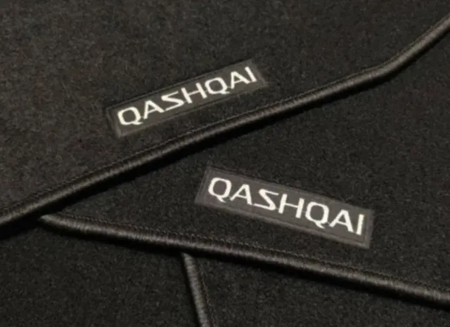 Juego de 4 Alfombras delanteras y traseras hechas a medida para Nissan Qashqai J11 5 Plazas, modelos desde 2014 a 2021, refuerzo en talonera, contorno cosido con hilo lana Negro, clips anclajes original, nuevas a estrenar.