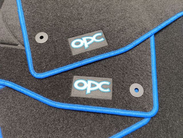 Juego de 4 Alfombras delanteras y traseras hechas a medida para Opel Corsa D modelo 2006 a 2014 y Corsa E modelo 2014 a 2019, con Logo OPC, refuerzo en talonera, contorno cosido con hilo lana Azul, clips anclajes de fijación originales, nuevas a estrenar.