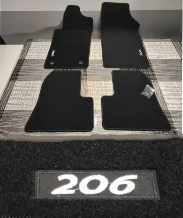 Juego de 4 Alfombras en Moqueta delanteras y traseras hechas a medida para Peugeot 206 / 206+ 3/5 Puertas y SW, modelos de 1998 a 2012, contorno en lana cosida con hilo Negro, clips anclajes de fijación originales, nuevas a estrenar.