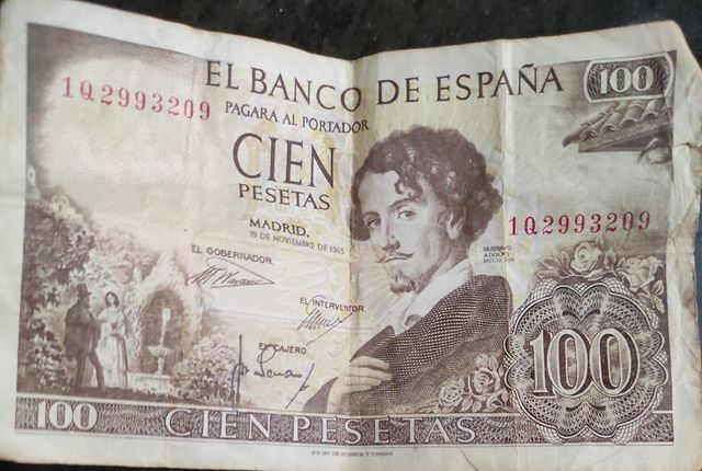 Detalles del producto1 antiguos billetes de 100 pesetas españolas. Se encuentran en buen estado para su edad, aunque muestran señales normales de uso.
