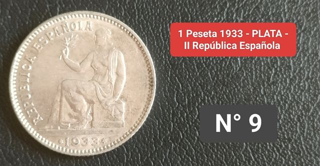 Detalles del productoMoneda de 1 peseta de 1933. PLATA. Periodo de la II República Española. Excelente estado de conversación.la de las fotos. N° 9.