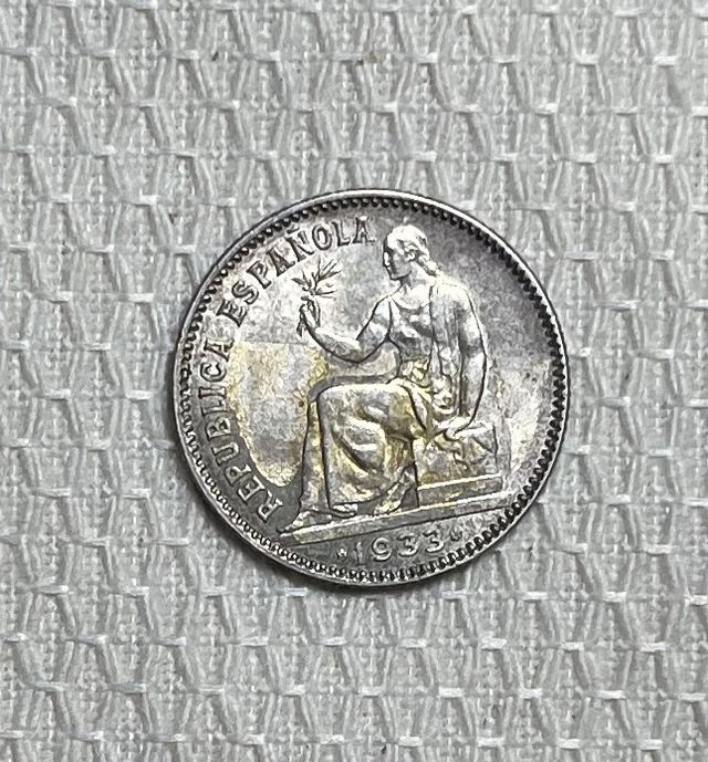 Moneda de 1 peseta de la República Española del año 1933. - Diseño con figura alegórica. - Canto con inscripción.
