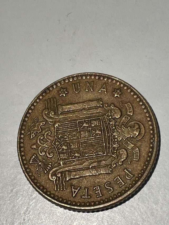 Detalles del productoMoneda de una peseta española del año 1975. Es la primera moneda acuñada durante el reinado de Juan Carlos I. - Se muestra en la imagen el anverso de la moneda. - Presenta un desgaste propio del tiempo.