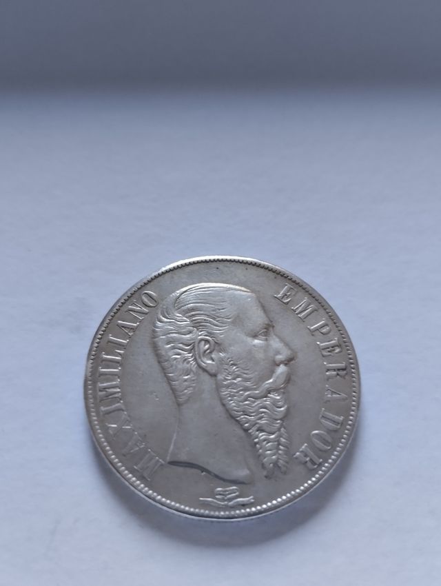 Moneda de 1 Peso Mexicano del Emperador Maximiliano I de México, acuñada en 1866. - Anverso: Retrato de Maximiliano I. - Reverso: Escudo imperial. - Canto: Estriado.
