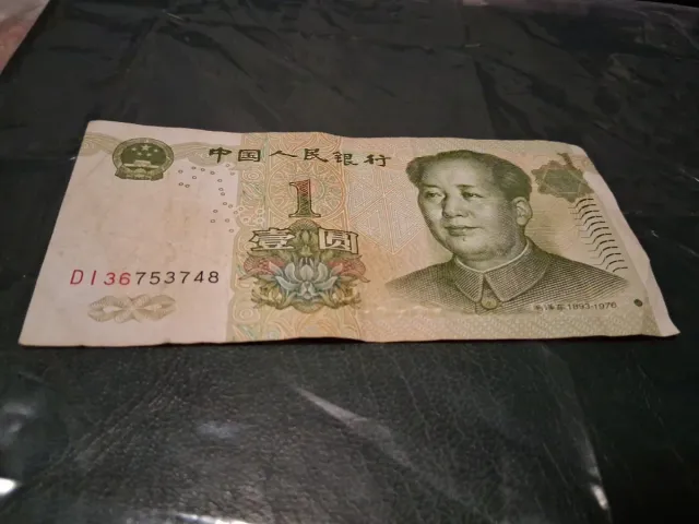 Billete de 1 yuan de China con la imagen de Mao Zedong. - Diseño clásico. - Serie D136753748. Puede cambiar.