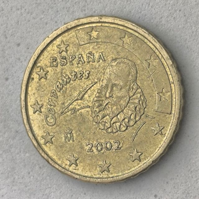 10-04087-España 10 cent € - 2002- cuño roto en la cabeza - Diseño: Retrato de Miguel de Cervantes Saavedra.