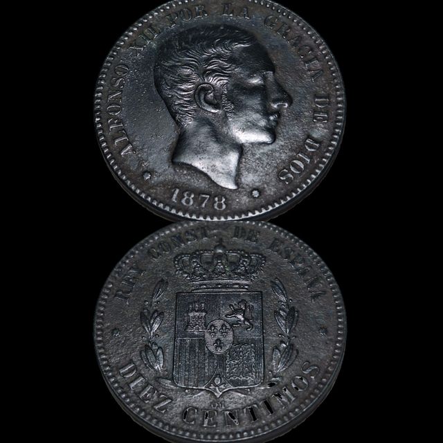 Detalles del productoPreciosa moneda de 10 céntimos de Alfonso XII SC (sin circular) fechada en 1878. Parece estar en muy buen estado de conservación, aunque presenta una pátina oscura.
