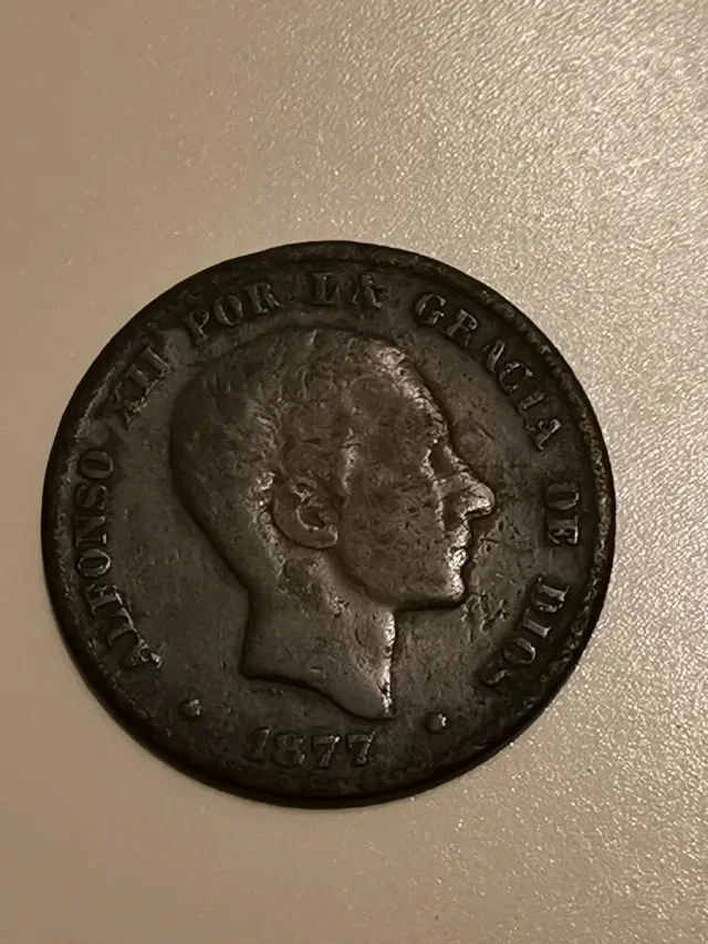 Moneda de 10 céntimos de Alfonso XII con fecha de 1877. - Diseño con el perfil de Alfonso XII. - Inscripción ALFONSO XII POR LA GRACIA DE DIOS.