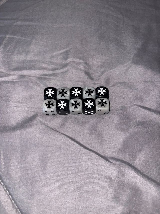 Conjunto de diez dados con diseño de Cruz Templaria. - Color: negro y blanco. - Diseño: Cruz Templaria.