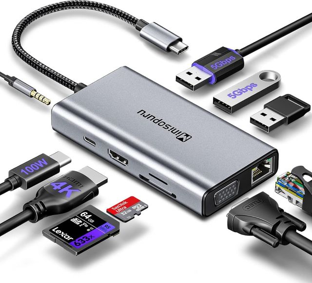 Detalles del productoUSB C Hub Multiport Adapter - Minisopuru 10 in 1 USB C Hub HDMI Adapter for DELL/HP/Lenovo Laptop, USB Hub with Ethernet, USB Hub for Laptop with VGA/HDMI/100W PD/Ethernet/SD/TF/Type-C/Audio