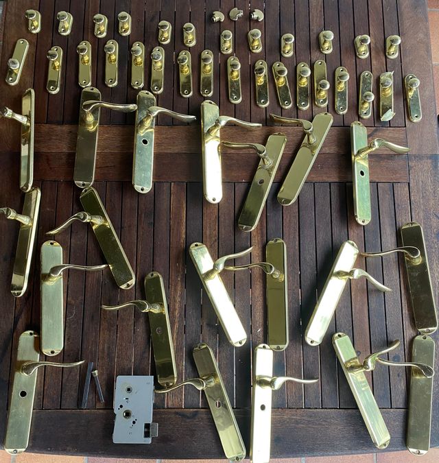 Detalles del productoSe venden manillas de puertas (10 juegos). 24 centímetros de largo. Material latón dorado. Buen estado. Tres de ellas tienen condena. Precio 15€ juego. También se venden tiradores de armario, dorados de latón, Precio 3€ cada juego