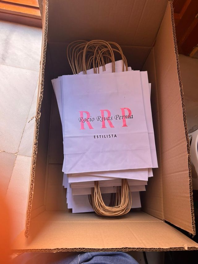 Lote de bolsas de papel personalizadas con el logo - Diseño elegante en color blanco. - Asas de papel retorcido en color marrón. - Ideales para comercios o eventos.