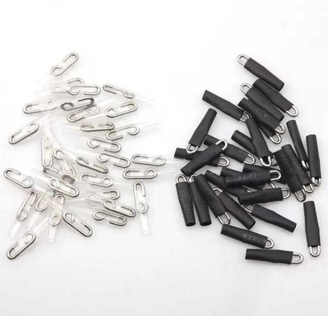 Detalles del producto100 unidades de enganche rápido , 14 mm de largo y un peso máximo de 25 kg, para pesca surfcasting, puede ser en negro o en transparente.