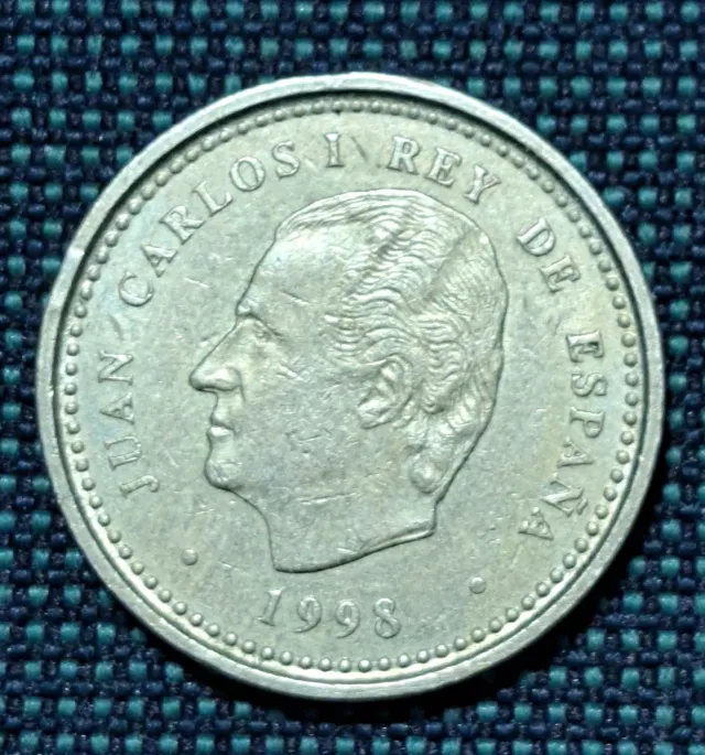 Moneda de 100 pesetas conmemorativa de Juan Carlos I. - Año de acuñación: 1998. - Diseño: Retrato de Juan Carlos I. - Leyenda: JUAN CARLOS I REY DE ESPAÑA.