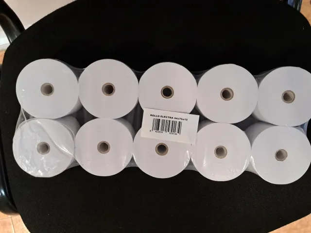 100 rollos en Pack de diez rollos de papel para impresora de tickets. - Rollos de papel térmico. - Medidas: 44x75x12 mm.