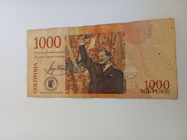 Billete de 1000 pesos colombianos del año 2006. - Representa a Jorge Eliécer Gaitán. - Incluye la frase El pueblo es superior a sus dirigentes.