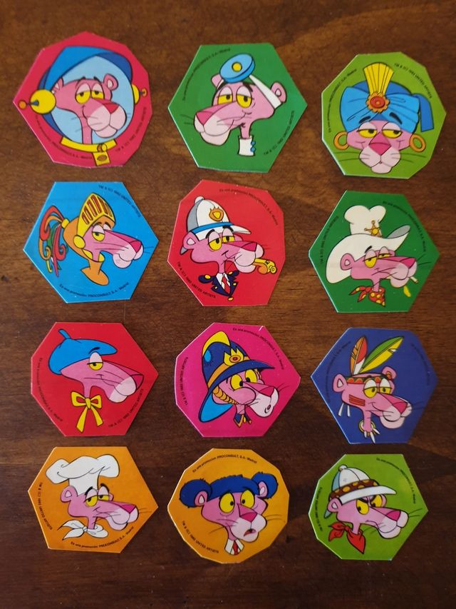 Detalles del productoSe venden 12 cromos de la Pantera Rosa, de la marca Bimbo. Son cromos antiguos, con ilustraciones coloridas y en buen estado.