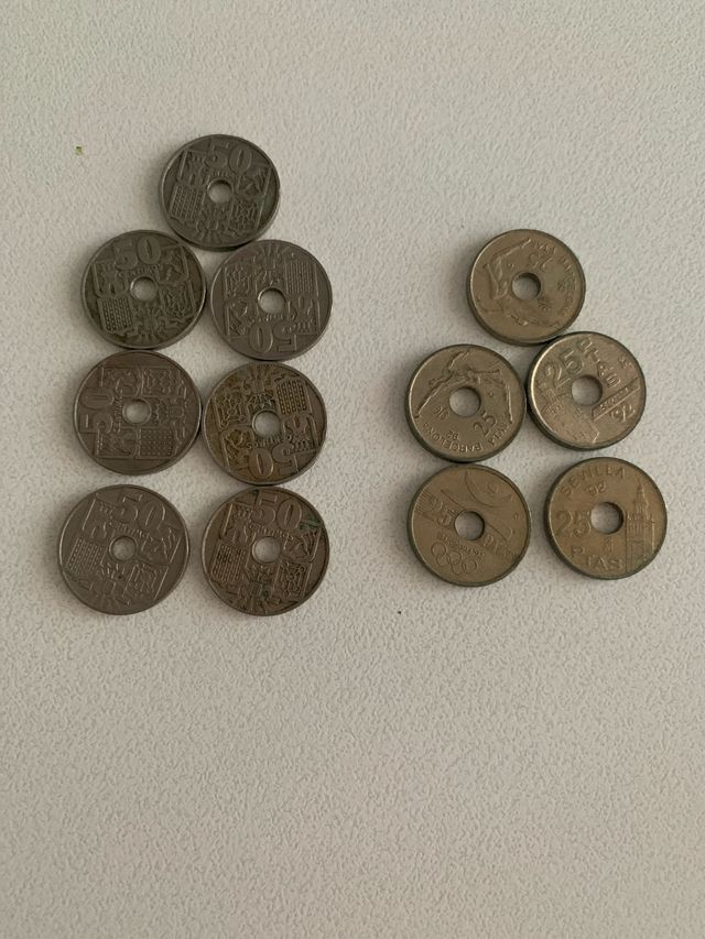 Detalles del productoLote de 12 monedas españolas con un diseño distintivo de agujero central.