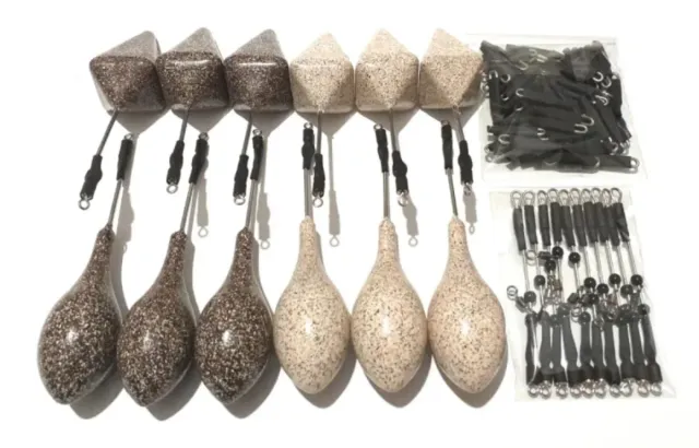 Detalles del producto✅ LOTES PESCA 🎣, 12 plomos de pesca surfcasting, 6 de Portugués 100 gramos, 3 color arena clara, 3 color arena oscura + 6 plomos pirámide de 100 gramos, 3 arena clara, 3 arena oscura, termoplástificados y termoretractil negro + 50 enganches rápidos de varilla Acero inoxidable de 1,2mm extra fuertes, diámetro 14mm x 3mm, color negro + 10 urfes de varilla Acero inoxidable de 1mm, con casquillos de 7 centímetros de largo, color negro.