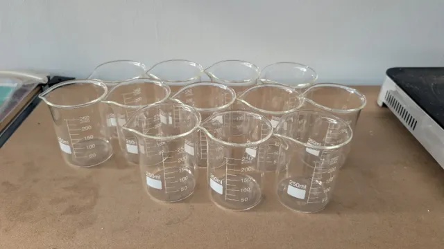 Se venden 12 vasos de precipitados de vidrio Pyrex. Son nuevos, sin estrenar. -Capacidas: 250ml -Material: Borosilicato -Cantidad: 12 unidades