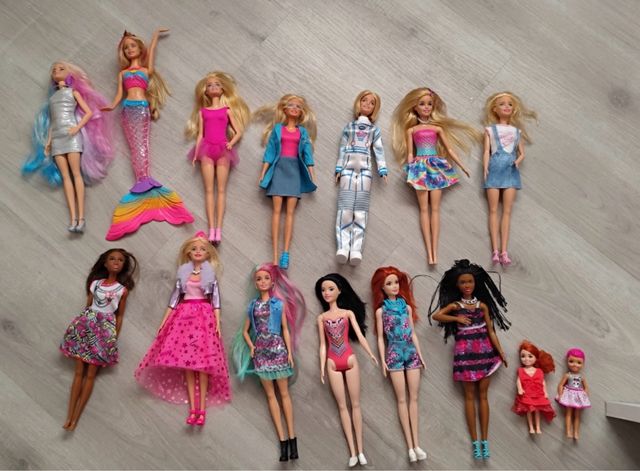 - Incluye 14 muñecas Barbie con diferentes atuendos y accesorios.