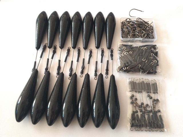 Detalles del productoLote pesca🎣, 14 plomos de pesca surfcasting de bala larga de 100 gramos termo plastificados, de color negro + 50 enganches rápidos de varilla Acero inoxidable de 1,2mm extra fuertes de color negro + 10 urfes de varilla Acero inoxidable con casquillos de 7 centímetros de largo, color negro + 20 anzuelos de carbono de pala del número 3.