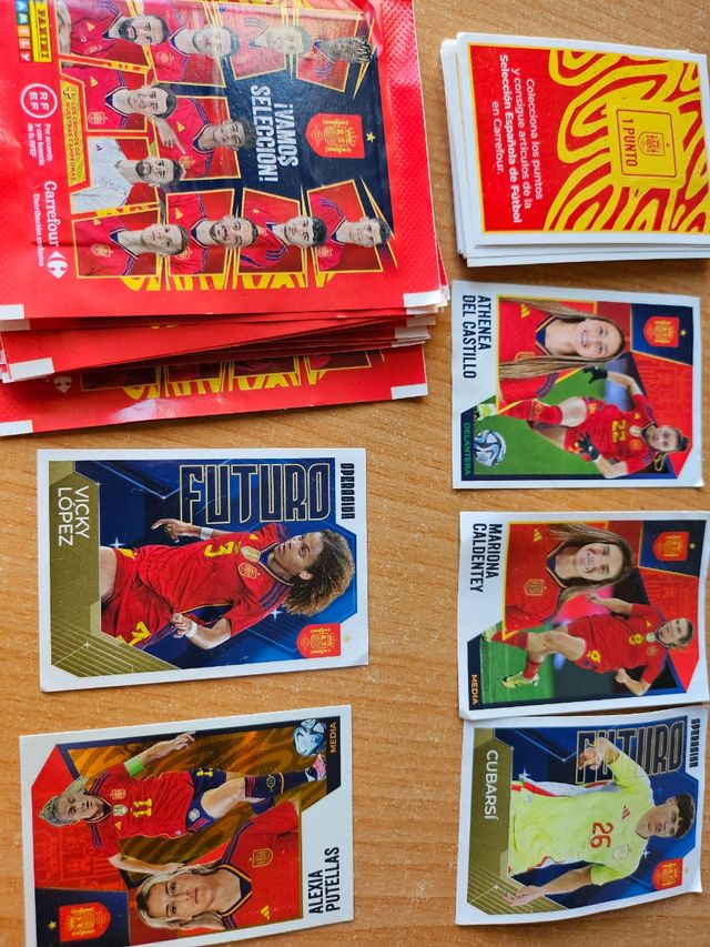 14 sobres sin abrir del álbum de la selección de Panini y Carrefour. De regalo los 5 cromos de la foto y un mazo de puntos.