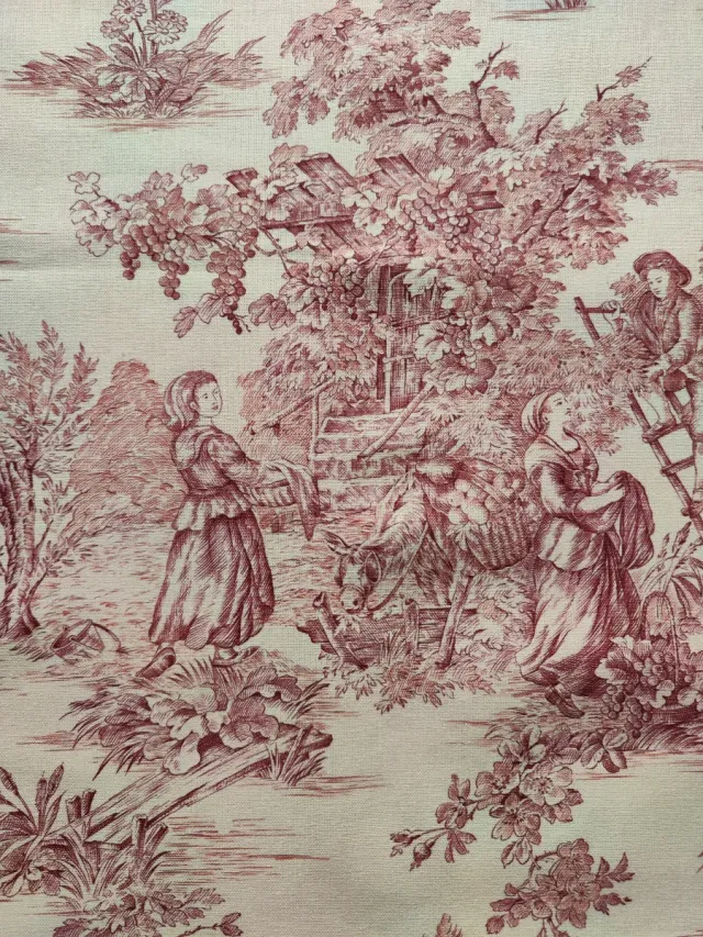 Detalles del productoRetal de tela fina, fuerte, algodón, con un diseño clásico estilo Toile de Jouy en color rojo sobre fondo crudo. Representa una escena campestre con figuras humanas, animales y elementos de la naturaleza. La medida es 1.50x1.00. El precio es por el retal entero.