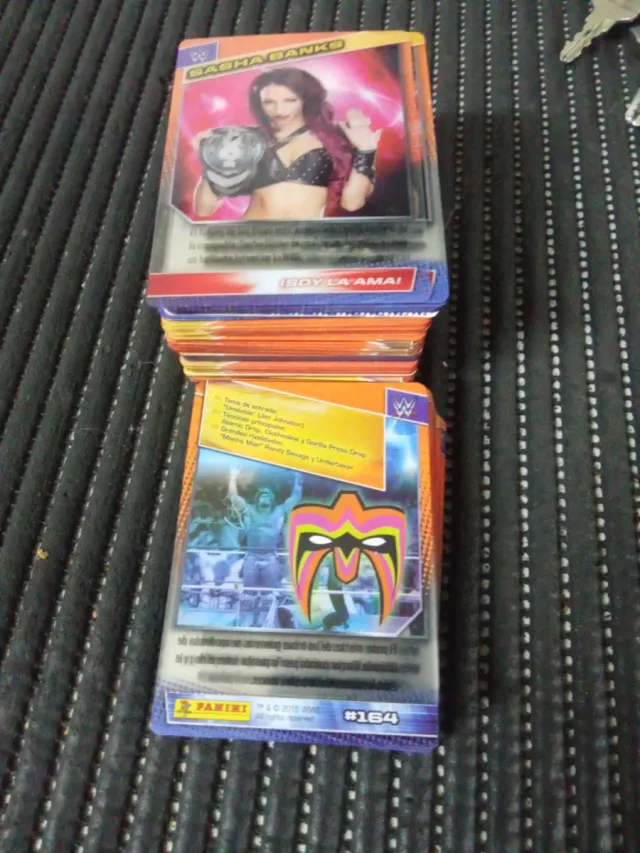 - Incluye tarjetas de luchadores como Sasha Banks y The Ultimate Warrior.
