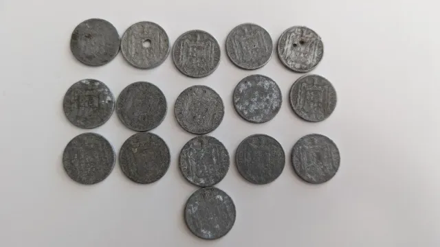 Lote de 16 monedas de 10 céntimos de entre 1940 y 1953. En mal estado en general. Tres de 1940, tres de 1941, ocho de 1945 y dos de 1953.